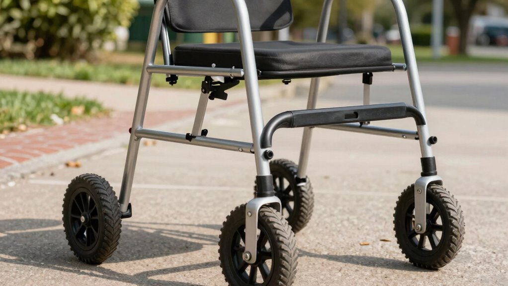Did you know that over 60% of outdoor accidents involve uneven terrain? Heavy duty rollators are designed to handle rough surfaces better than standard models, making them suitable for outdoor use. They provide enhanced urban mobility and stability on uneven ground, so you can confidently navigate outdoor paths. Just make sure your rollator has sturdy wheels and appropriate ground clearance for ideal outdoor performance.