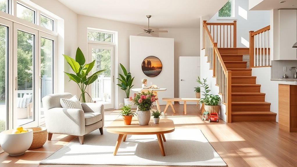Designing multigenerational homes means creating spaces that are safe, accessible, and comfortable for everyone. Incorporate wider doorways, zero-threshold entryways, and open floor plans to cater to all mobility levels. Add assistive tech like smart lighting or voice controls to enhance independence. Consider future needs with flexible layouts, ground-floor bedrooms, and safety features such as sturdy bathroom grab bars. Keep aesthetics warm and inclusive. Exploring these features further will help you build a truly welcoming family home.