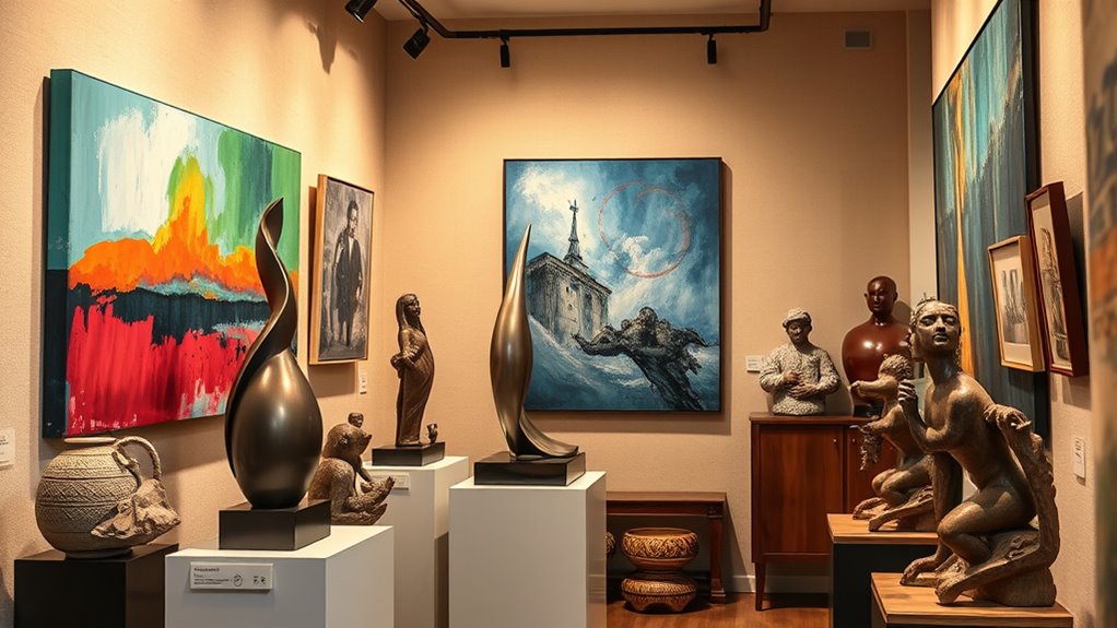Ultimately, the art placement and sculpture styles you choose reveal your personality and aesthetic preferences. By carefully selecting and positioning your pieces, you craft a space that’s uniquely yours—dynamic, inviting, and full of character. It’s about finding the right balance between visibility and harmony, so your artwork becomes an authentic extension of your style. When you invest thought into how you display your sculptures and artwork, you create a home that’s both visually stunning and deeply personal. Recognizing the importance of art placement can significantly enhance the overall ambiance and cohesion of your interior design.