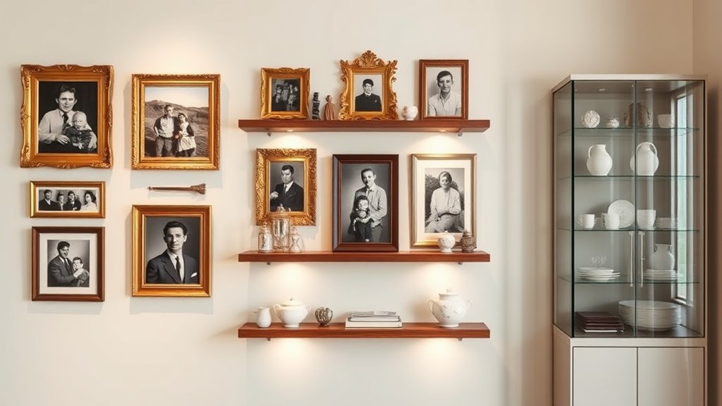 To showcase your photos and heirlooms beautifully and safely, create a dedicated gallery wall with a mix of modern and vintage frames, using UV-protective glass to preserve your memories. Incorporate vintage trays or shadow boxes for fragile items, and guarantee all pieces are securely hung with sturdy hooks. Regularly update your displays to keep them fresh and engaging. Continue exploring ways to balance aesthetics with protection to truly make your space unique.