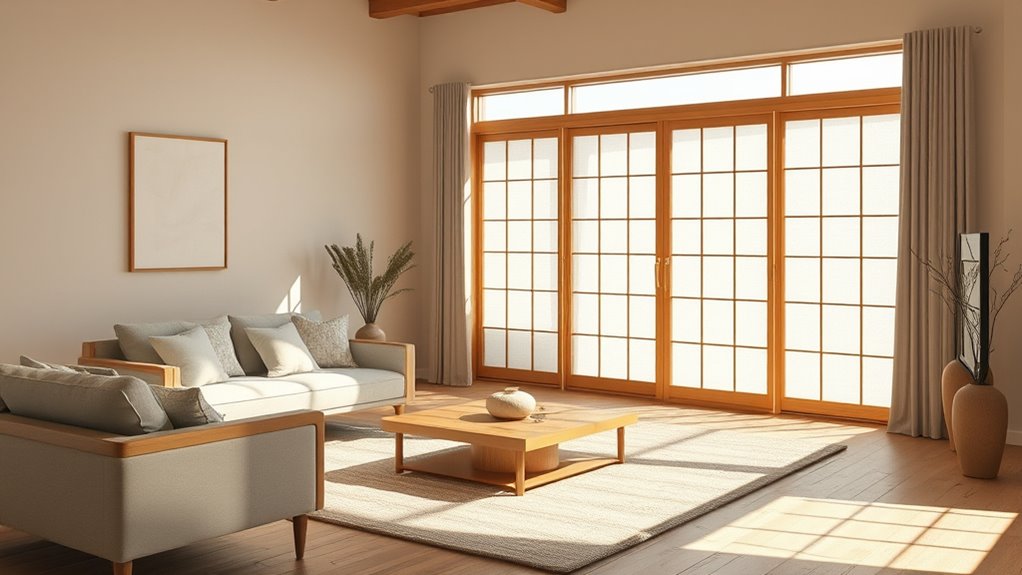 You should choose sleek Scandinavian furniture with clean lines and natural wood finishes to fit the Japandi style. Incorporate traditional Japanese pieces like low tables, tatami mats, or shoji screens to add authentic charm. Opt for simple, functional designs that emphasize craftsmanship and minimal ornamentation. This blend creates a balanced, tranquil space, highlighting both Scandinavian minimalism and Japanese tradition for a serene, harmonious home.