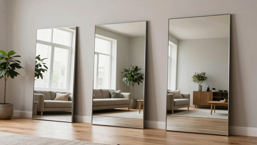 Another key aspect is glare reduction. Glare occurs when sunlight or artificial light hits the mirror at certain angles, creating harsh reflections that strain your eyes and make it difficult to see clearly. To prevent this, consider the light sources around your mirrors. If a mirror faces a window, you might install window treatments like blinds or curtains that can be adjusted throughout the day. Using matte or anti-reflective coatings on your mirrors can also notably cut down on glare. Additionally, positioning mirrors at angles that deflect light away from your line of sight helps tame the brightness. For example, angling a mirror slightly upward or downward can redirect reflections toward less sensitive areas, reducing glare while still capturing the reflective benefit. Paying attention to light interaction can help you optimize mirror placement and minimize undesirable reflections.