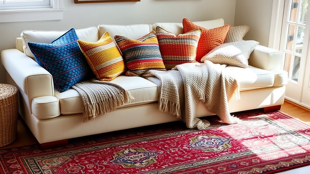 Using throws, pillows, and rugs is an easy way to add comfort, warmth, and style to your space. Choose textiles that complement your color scheme and mix different textures for visual interest. Switch up your accessories seasonally or as your style evolves to keep your space fresh and inviting. Propercare and thoughtful layering can make your space both cozy and stylish. Keep exploring to discover more tips for decorating with textiles that transform your home.