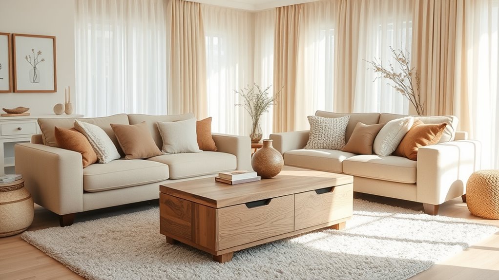 Just like a warm embrace, decorating with neutrals creates a sanctuary of calm and comfort. By choosing soothing tones, you invite serenity into your space, turning everyday moments into a retreat reminiscent of a peaceful haven. Remember, as in a classic story, sometimes the simplest hues hold the most power—transforming your home into a timeless, inviting escape. Embrace these warm neutrals, and let your space tell a story of tranquility and warmth.
