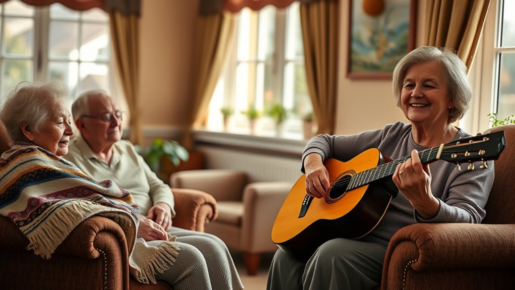 Music therapy works wonders in elderly care by reconnecting seniors with memories, boosting mood, and supporting cognitive health. It encourages physical activity, fosters social bonds, and promotes emotional well-being through personalized playlists and group activities. These musical experiences can slow memory decline and enhance overall quality of life. If you want to discover how to harness these powerful benefits, explore further to see how tunes can transform senior care environments.
