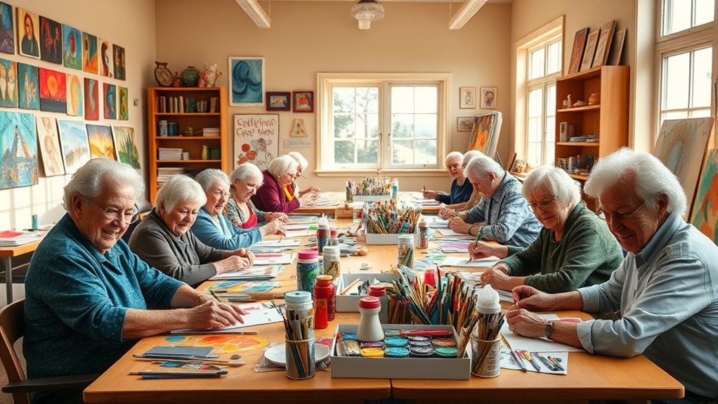 Participating in art activities boosts your mental stimulation and enhances emotional well-being. You’ll keep your mind active as you learn new techniques and focus on creative projects, reducing the risk of cognitive decline. Additionally, expressing yourself through art helps manage stress, improves mood, and fosters a sense of accomplishment. Engaging regularly in these activities supports overall mental health and emotional resilience, making your retirement more fulfilling and vibrant.