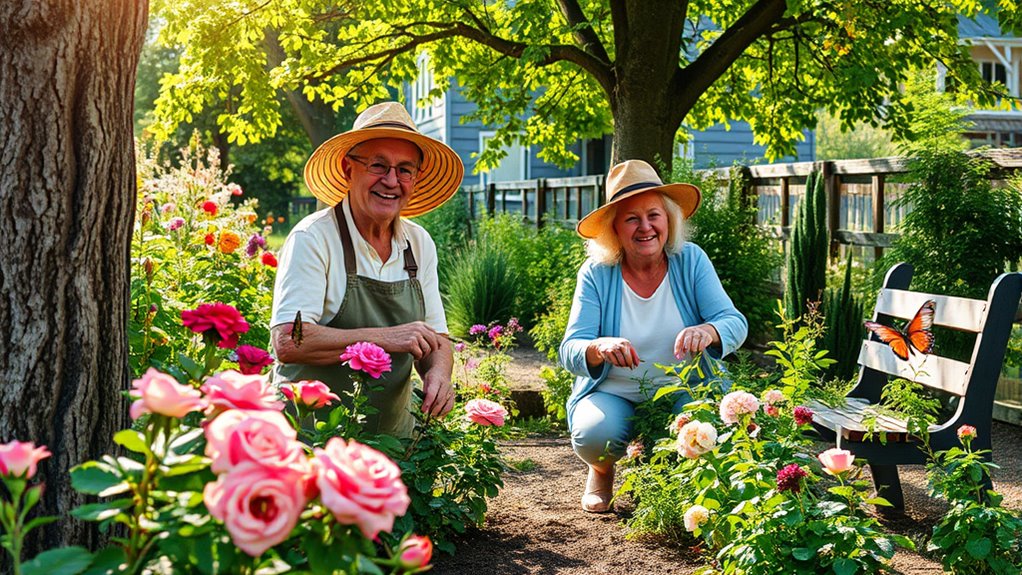 Gardening offers many benefits for your joy and health, helping you stay active, relax mentally, and enjoy the outdoors. You can make it easier by using raised beds, containers, and low-maintenance plants suited to your climate. Design accessible pathways and seating areas to stay comfortable, and choose lightweight tools to reduce strain. With thoughtful planning, gardening can be both rewarding and safe—keep going to discover how to create your ideal, enjoyable outdoor space.