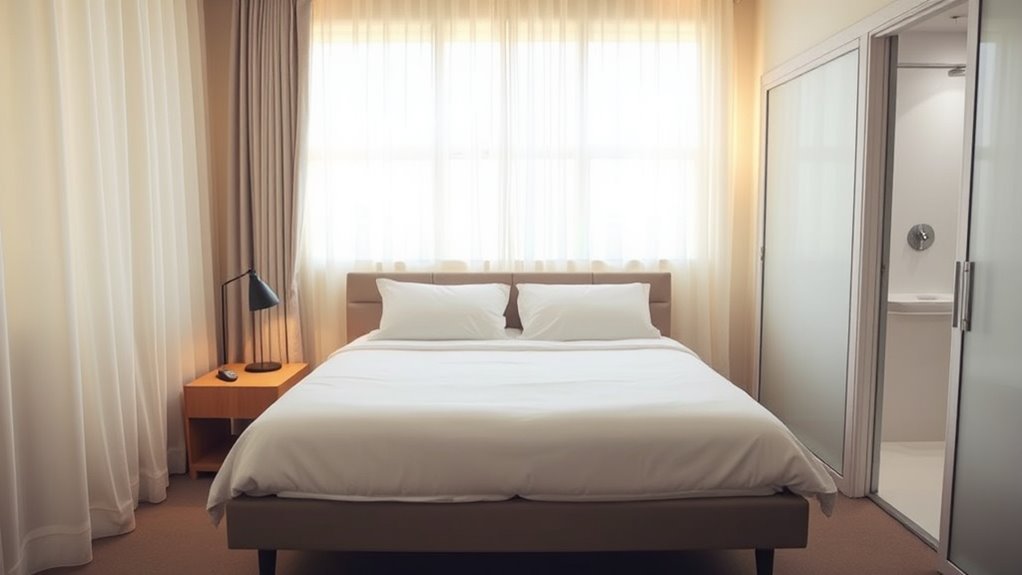 Creating a safe bedroom layout is vital for preventing accidents and guaranteeing peace of mind. When designing your space, you want to prioritize both safety and accessibility, making sure that every element serves a purpose in protecting those who sleep there. One key aspect is the placement of furniture and exits, especially fire escape routes. You need to guarantee that any emergency escape route is clear, well-marked, and easily accessible from all parts of the room. Avoid blocking windows or doors with large furniture pieces, so in case of a fire or other emergency, you can evacuate quickly without obstruction. It’s wise to keep a clear path to the door at all times, and if you have a second exit, such as a window, make sure it’s easily reachable and not obstructed by clutter or heavy furniture.