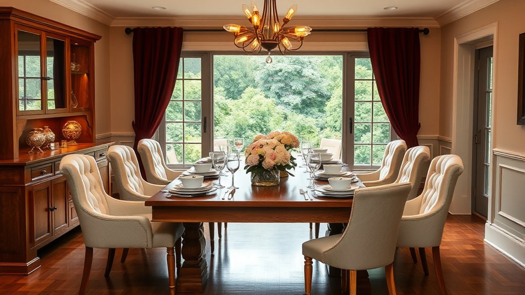 Imagine your dining space as a lively river, flowing smoothly without obstructions. You want traffic flow and accessibility considerations in mind, ensuring guests can move freely without bottlenecks. Position furniture to create clear pathways, like gentle currents guiding everyone through. Keep enough space around the table for easy movement, and avoid placing furniture where it blocks entryways or windows. This setup keeps your space inviting and functional for all.