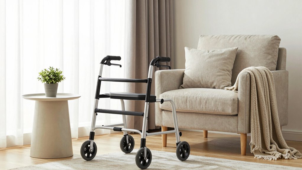Arranging furniture around a walker or rollator can considerably improve safety and mobility in your home. When you’re designing or reorganizing your space, it’s essential to focus on space optimization. You want to create clear pathways that allow for smooth movement without obstacles, ensuring that the walker or rollator can glide effortlessly from room to room. This means removing unnecessary furniture, bulky items, or clutter that might block your way. Opt for furniture pieces with slim profiles or those that can be easily moved aside, which helps maximize the available space. A well-thought-out layout not only makes navigation easier but also reduces the risk of tripping or falling, addressing critical safety considerations.