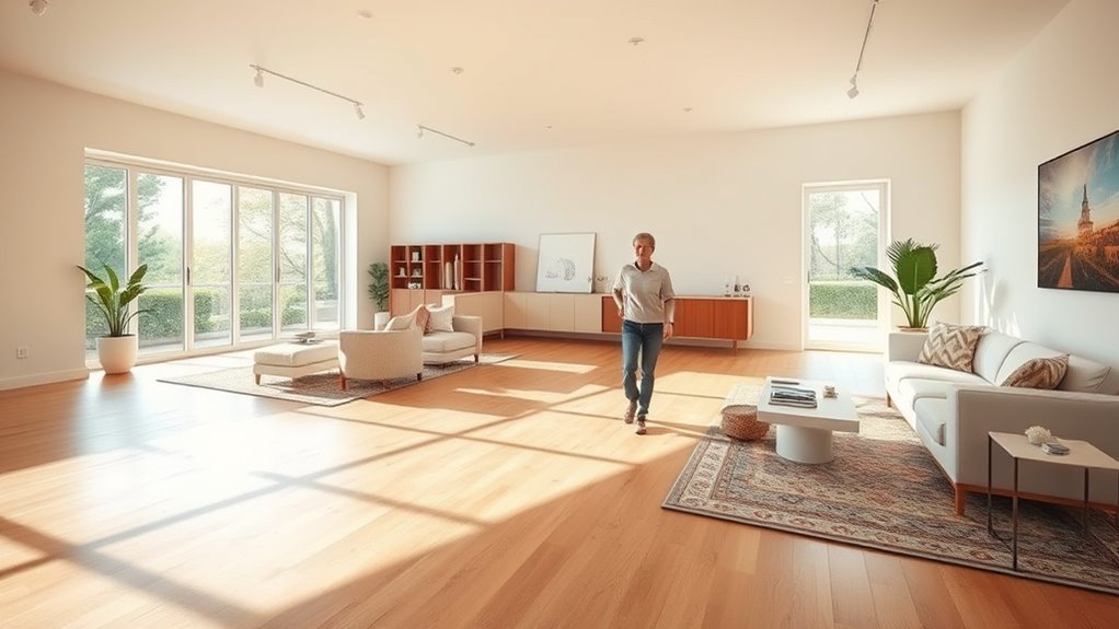 By embracing open floor plans, you create a smooth, flowing space where movement feels like gliding on a calm lake, free from obstacles that might trip you up. These layouts act as a gentle breeze, reducing fall risks and fostering confidence in your daily steps. As your environment opens up like a bright, welcoming sky, you’ll find safety and ease woven seamlessly into your home’s design, making every step a confident stride into comfort.