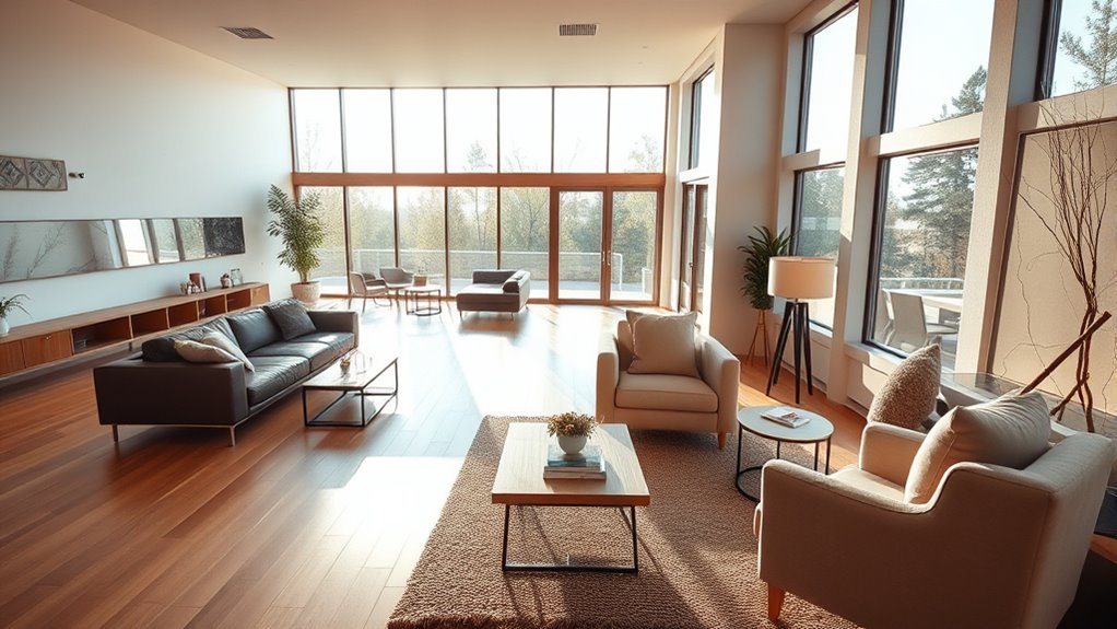 Furniture placement directly impacts your energy efficiency by optimizing space and reducing energy waste. With thoughtful furniture arrangement, you can improve natural light flow and air circulation, decreasing reliance on artificial heating or cooling. Proper layout helps conserve energy by positioning furniture to maximize insulation and minimize drafts. By consciously arranging your furniture, you support energy conservation and create a more comfortable, eco-friendly living environment tailored to your needs.