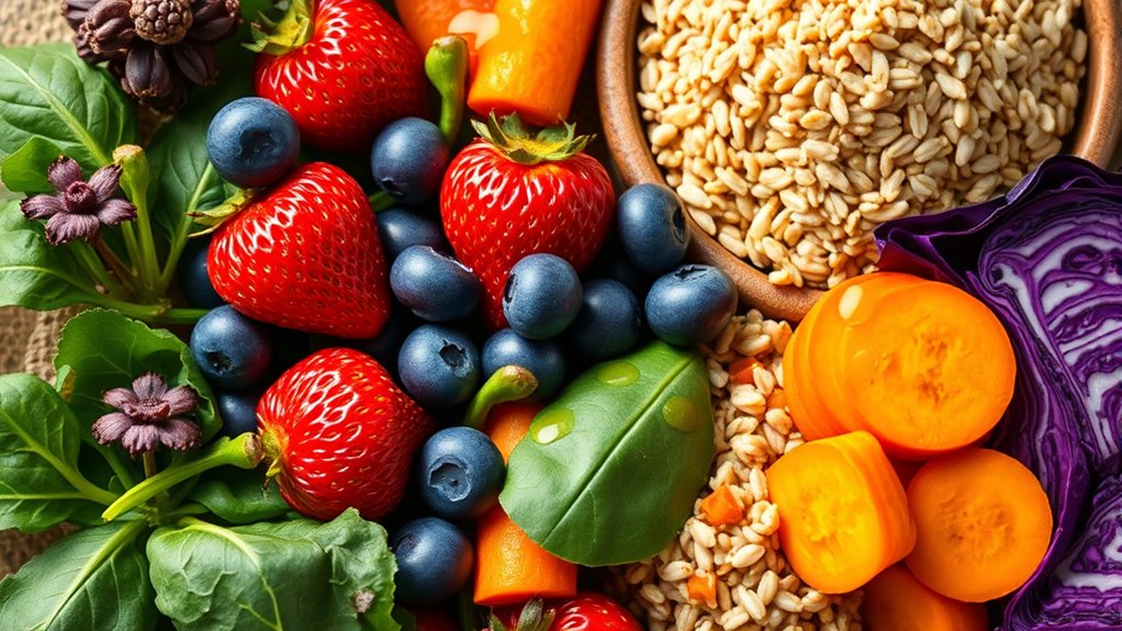 To improve your heart health, focus on eating plenty of fruits, vegetables, whole grains, and healthy fats like olive oil, nuts, and avocados. These foods are rich in fiber, antioxidants, and good fats that lower bad cholesterol, reduce inflammation, and support your blood vessels. Replacing refined grains with whole grains and choosing plant-based fats can make a big difference. Keep exploring to discover simple ways to incorporate these heart-smart choices into your daily routine.