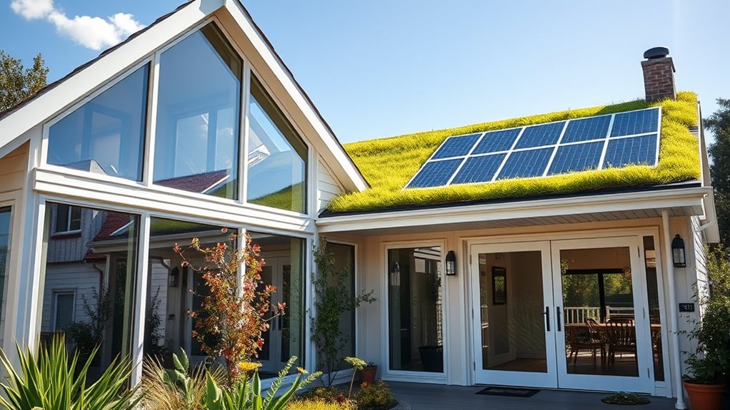 Implementing energy-efficient upgrades like solar panels and smart thermostats can markedly cut your costs and boost your home’s comfort. Solar panels generate free, renewable energy, reducing your reliance on the grid and lowering utility bills over time. Smart thermostats learn your routines to optimize heating and cooling, saving energy without sacrificing comfort. Both solutions are easy to install and manage, making your home more sustainable and cost-effective. Keep exploring to discover how these upgrades can transform your living space.