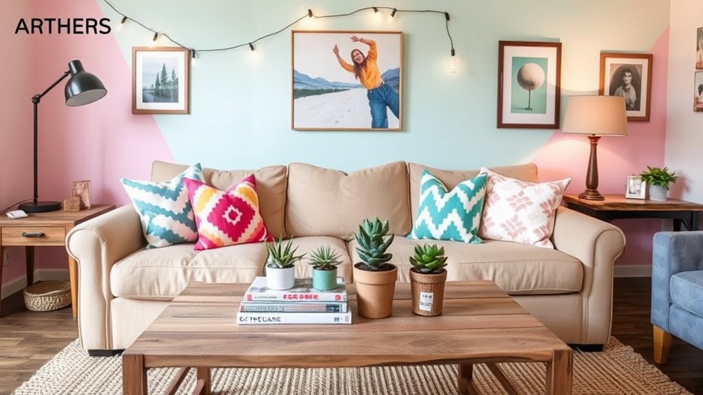 You can add personality to your home affordably by incorporating artistic wall decor that reflects your style and using custom textiles like throw pillows or curtains to bring unique flair. These simple updates make your space feel personalized without breaking the bank. Focus on bold colors, interesting patterns, or meaningful artwork, and you’ll create a vibrant, inviting atmosphere that truly feels like yours.