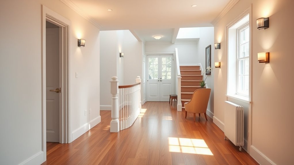 To prevent falls, improve your home’s lighting by adding bright, well-placed fixtures and automatic or motion-sensor lights in dark areas. Keep walkways, stairs, and entryways clear of clutter, securing rugs and organizing items to avoid tripping hazards. These upgrades make moving around safer, especially at night, and boost your confidence around the house. For simple tips to make your home even safer, you’ll find helpful ideas if you continue exploring.