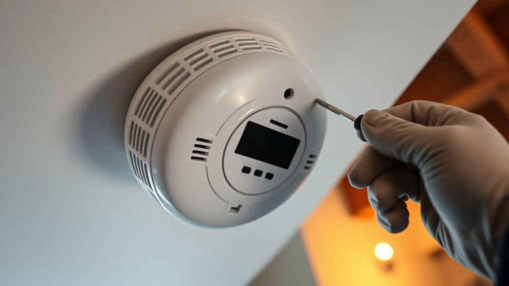You should replace the batteries in your detectors at least once a year, as part of regular maintenance. Battery life varies, but most detectors have a low-battery alert to remind you. If your detector uses 10-year sealed batteries, you won’t need to replace them during that period. To guarantee safety, check your detectors monthly and replace batteries promptly when needed, maintaining peak performance and reliable alerts.