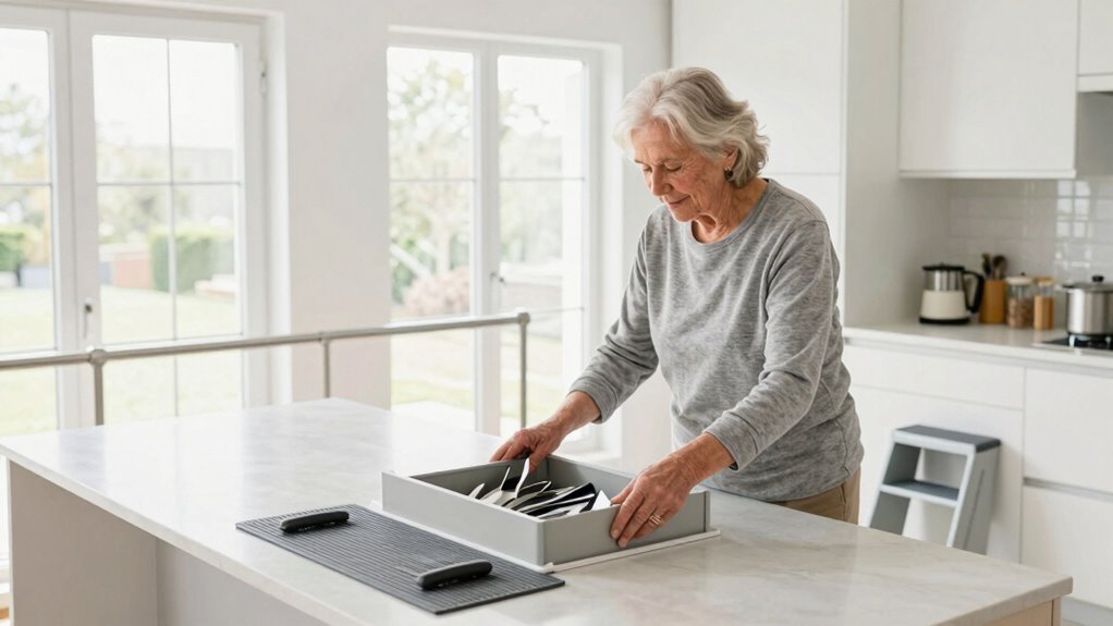 Are you worried about safety in your loved one’s kitchen? You should be. Consider safety gadgets like stove knob covers and anti-slip mats, plus ergonomic tools that reduce strain. These products make cooking safer and easier, preventing accidents and enhancing independence. Using these safety items shows you care deeply about their well-being, giving both of you peace of mind in everyday activities.