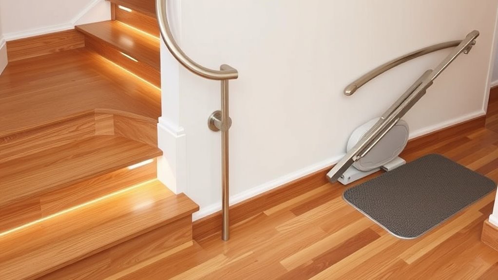 Adding handrails, stair lifts, and step-free options can greatly improve your home’s safety and accessibility. Installing sturdy handrails on one or both sides provides support, reducing fall risks. Stair lifts offer smooth mobility between floors, ideal for those with limited strength or injuries. Ramps provide a permanent, step-free solution that fits various spaces. These upgrades are budget-friendly and can make your home safer and more functional. Keep exploring to find out more ways to enhance your stairway safety.