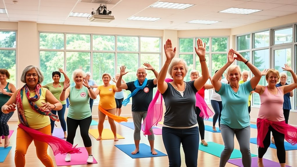 Joining group exercise classes like Zumba Gold, Tai Chi, and yoga can be a great way to stay active, social, and motivated as a senior. These classes are designed to be gentle and adaptable, helping improve your balance, flexibility, and overall well-being. Plus, they create opportunities to connect with others who share your goals and experiences. Keep exploring to discover how these activities can boost your health and happiness even more.