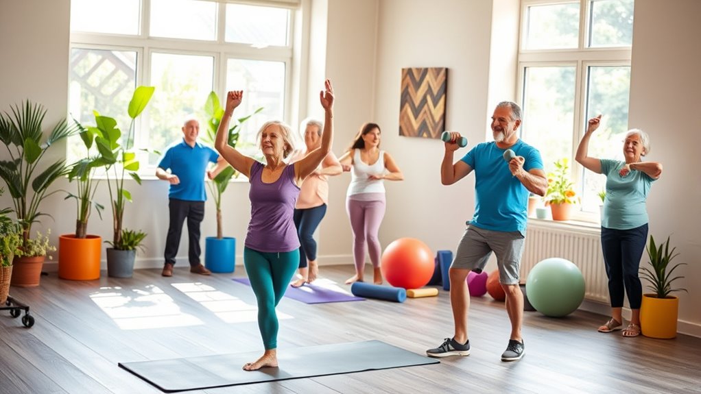 Strengthening exercises are essential for seniors, helping to combat muscle and bone mass loss that often accompanies aging. Incorporating these exercises into your routine at least two days a week is crucial. Simple movements like wall pushups, pelvic tilts, and seated leg lifts effectively strengthen your muscles while being gentle on your joints. Engaging in abdominal contractions while lying down can markedly improve balance, making daily activities easier and safer. Regular participation in physical activity can also lead to enhanced color accuracy in your movements, allowing for better coordination and stability. Additionally, staying active can contribute to astrological compatibility which may enhance your interpersonal relationships, promoting a positive self-image. Incorporating strengthening exercises into your weekly routine can also help mitigate the risk of falls, a common concern for older adults. Moreover, maintaining an active lifestyle can promote mental well-being, which is crucial for emotional health as you age.