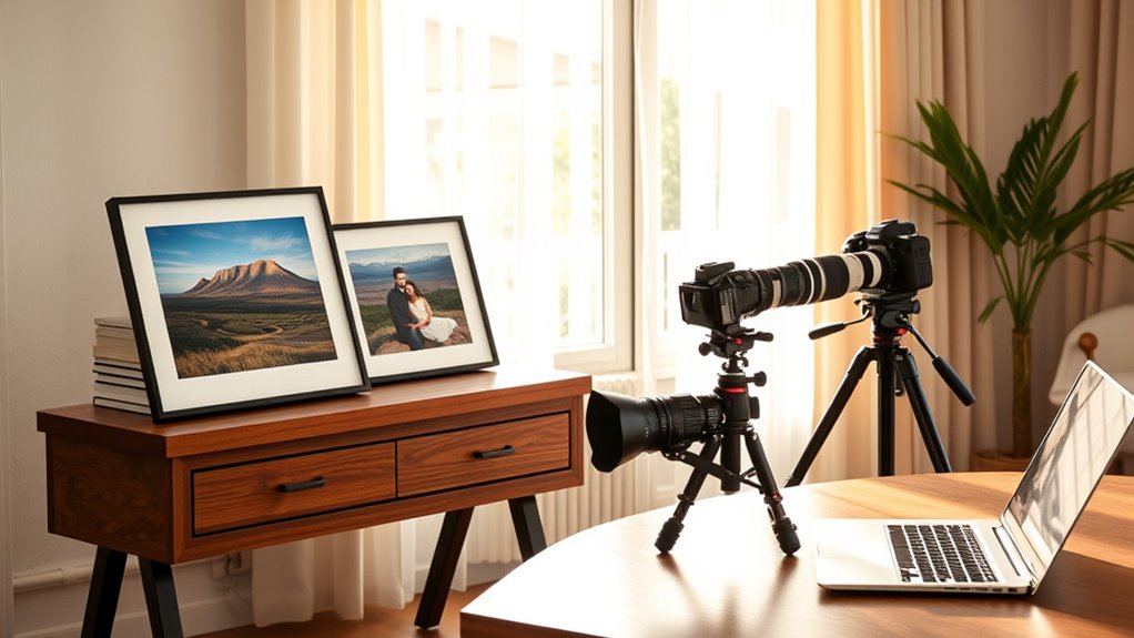 Have you ever considered turning your passion for photography into a side gig? If so, you’re already halfway there—your camera gear is likely ready to go, and your eye for detail sets you apart. Selling prints and offering sessions can be a lucrative way to earn extra income, but success hinges on how well you understand your market and how effectively you price your work. First, think about your camera gear. You don’t need the most expensive equipment on the market, but having a reliable camera and quality lenses is vital. Your gear influences the quality of your images, which in turn affects what you can charge. When you’re starting out, focus on the gear that best fits your style and budget; as your business grows, you can invest in upgrades. This approach guarantees you remain profitable while building your portfolio. Additionally, understanding color accuracy and how to calibrate your equipment can significantly enhance the quality of your prints and sessions.