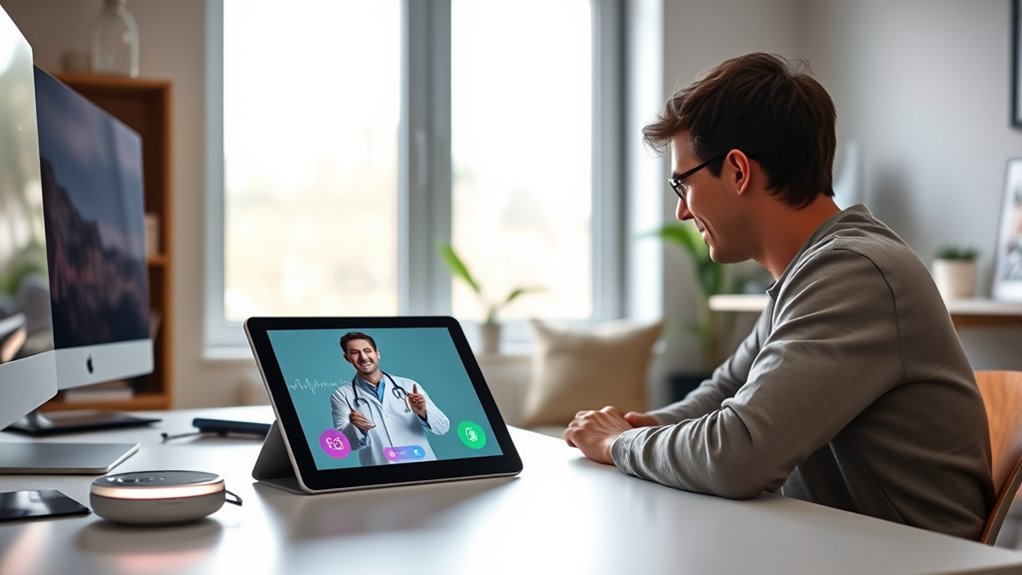 Technology integration plays a fundamental role in making telehealth effective. Devices such as wearable fitness trackers, blood pressure monitors, and glucose sensors seamlessly connect to telehealth platforms. These tools collect and transmit your health data automatically, allowing your healthcare team to monitor your condition continuously. The integration of these technologies ensures that your health information is accurate, timely, and easily accessible for your provider. This real-time data allows for more precise diagnoses, better management of chronic conditions, and immediate adjustments to treatment plans if necessary. It also helps you stay engaged in your health by providing instant feedback and alerts, empowering you to make informed decisions about your lifestyle and treatment. Additionally, understanding how emotional support can enhance patient engagement and adherence is crucial for holistic health management.