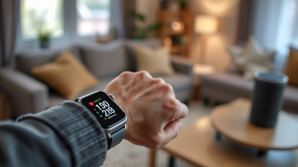 Another vital aspect of these devices is activity monitoring. Wearables continuously track your movements and habits, giving you and your caregivers valuable insights into your daily routines. This data helps identify patterns, such as changes in sleep quality, irregular activity levels, or decreased mobility, which could signal underlying health issues. For instance, if your wearable detects a sudden drop in activity, it might prompt a check-in or alert your healthcare provider. This proactive approach allows you to catch potential health problems early, rather than waiting until symptoms worsen. Plus, activity monitoring encourages you to stay active, as many devices set personalized goals or send reminders to move, walk, or perform simple exercises. Staying engaged physically can improve overall health, mood, and independence, making wearables an essential part of your health management toolkit. Additionally, user-friendly interfaces ensure that seniors can easily navigate and utilize these devices without frustration or confusion.