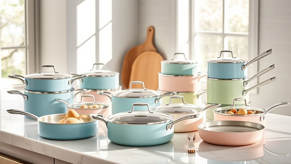 I’ve looked into the top Caraway cookware sets of 2025, and my picks include versatile options like the 24-piece nonstick sets, mini sets, and specialty pieces like Dutch ovens. These sets stand out for their durable, toxin-free ceramic coatings, stylish modern designs, and compatibility with all stovetops. Whether you want a complete collection or smaller pieces, I’ll help you find the perfect fit—stick with me to discover more about these highly-rated choices.