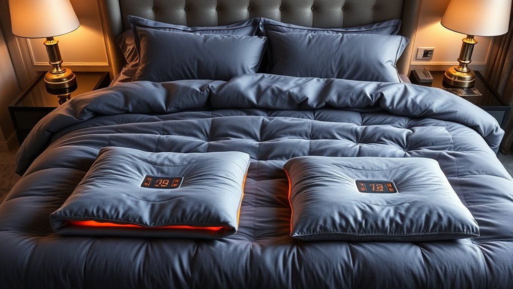Dual controls prevent overheating by constantly monitoring and adjusting the temperature on each side. I’ve found that these blankets use built-in thermostats and safety shut-offs, which automatically cut power if the heat gets too high. This guarantees safe, even warmth without risks. So, when you’re snuggling in, you can relax knowing the blanket keeps the temperature just right without overheating.