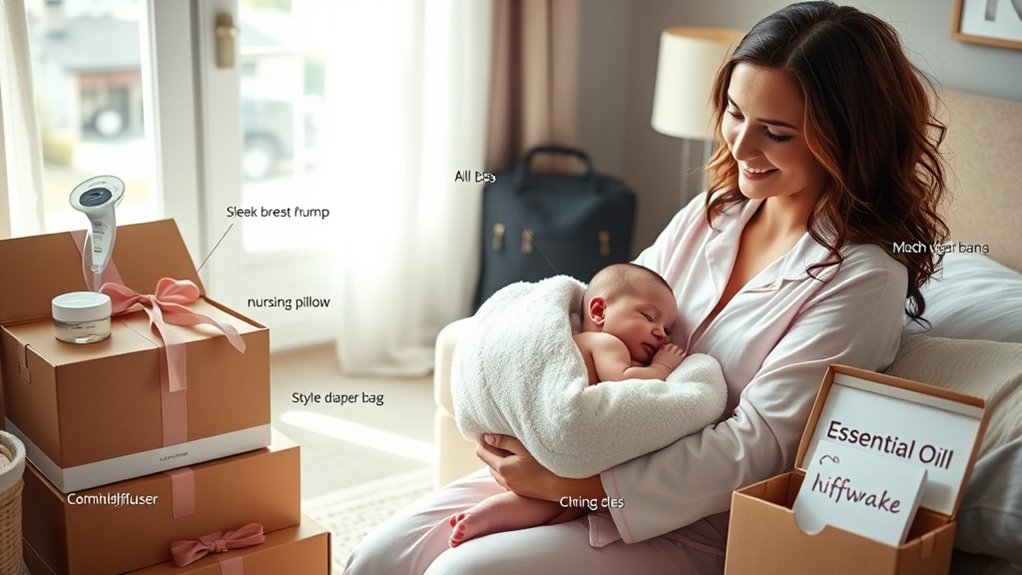 You can personalize gifts for new moms by adding their name or baby’s name to items like mugs, blankets, or jewelry. I love customizing photo frames or creating a keepsake box filled with meaningful mementos. Consider monogramming essentials or including a heartfelt handwritten note. These small touches make the gift unique and show thoughtfulness, making her feel truly appreciated during this special time.