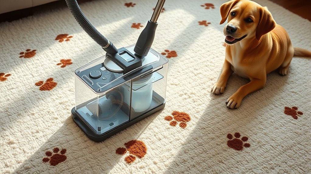 Effective odor removal is vital when selecting a portable carpet cleaner for pets because lingering smells can make any space uncomfortable. I look for models with strong deodorizing formulas or odor neutralizers that tackle pet smells at the source. Some cleaners incorporate carbon filters or enzymes designed to break down stubborn odors from urine, vomit, or feces, offering a more permanent solution. Enzymatic formulas are especially effective—they can eliminate organic odors completely. Additionally, having longer cleaning solutions or specialized odor-focused accessories helps guarantee odors are thoroughly neutralized. Regular maintenance, like cleaning tools and emptying tanks, is also indispensable to prevent odors from lingering. Choosing a cleaner with these features guarantees a fresher, more inviting environment after every pet accident.