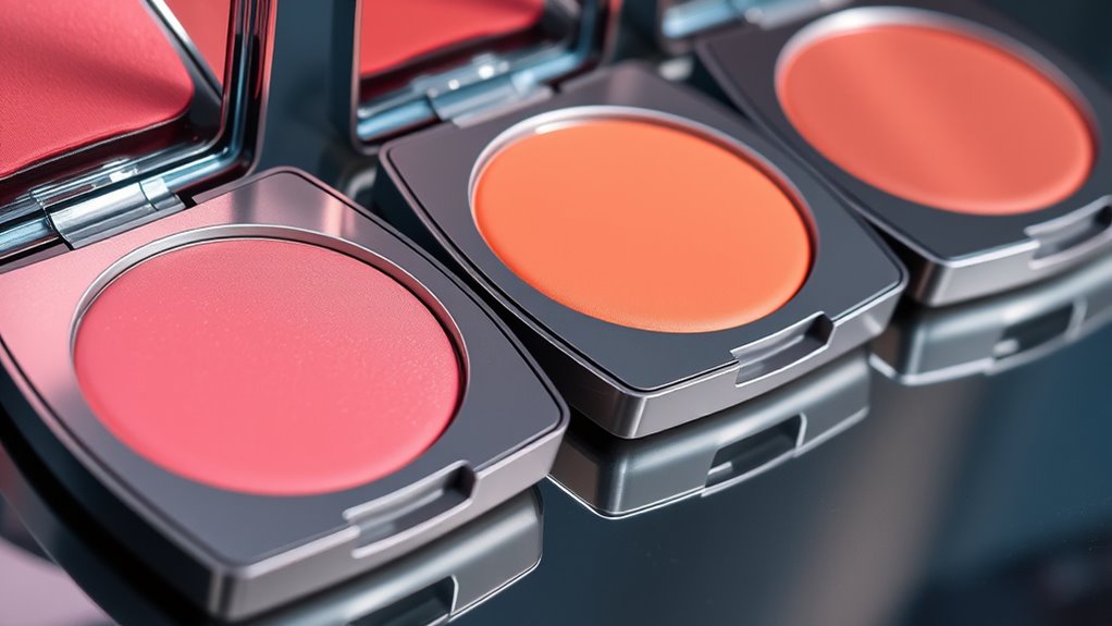 To guarantee your blush stays vibrant all day, it’s essential to select formulas that are waterproof and sweat-proof, as these resist fading through various conditions. When browsing Amazon, check product descriptions for claims of long-lasting or durable wear, indicating extended performance. I find that liquid or cream textures often adhere better to the skin, resisting smudging and fading over time. Building up coverage is also helpful; it allows me to layer for a more intense, lasting color payoff without feeling cakey. Customer reviews are invaluable—they often report how well a blush maintains its vibrancy in different environments and throughout the day. Choosing a product with these features ensures your blush remains fresh, vibrant, and flawless from morning to night.