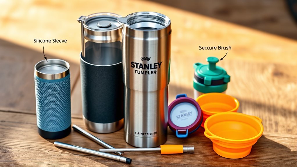 To make cleaning my Stanley tumbler accessories straightforward, I prioritize those made from dishwasher-safe materials, so I don’t have to scrub by hand. I also look for products with smooth surfaces and minimal crevices, which help prevent dirt and residue buildup. Choosing accessories that fit my tumbler’s size and shape is essential, as awkward designs can make cleaning difficult. I prefer items with removable parts or features that are easy to wipe down or scrub, ensuring thorough cleanliness. I avoid accessories with intricate designs or non-dishwasher-safe components because they tend to trap dirt and complicate maintenance. Overall, selecting accessories that are simple to clean saves me time and keeps my tumbler hygienic and ready for use.