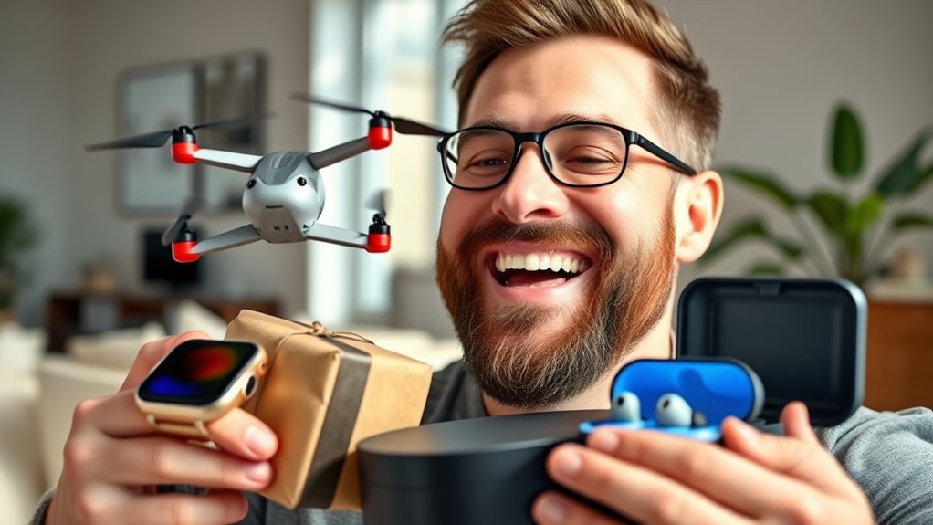 When choosing a tech gift for dad in 2025, focusing on practicality and usefulness is vital. Look for devices that address everyday needs or simplify tasks, making his routine smoother. Consider whether the gadget enhances productivity or convenience—these qualities add real value. Multi-functionality is a big plus; a single item that serves multiple purposes maximizes usefulness. It’s also essential to ensure the device is compatible with his existing tech ecosystem, preventing frustration and ensuring seamless integration. Finally, prioritize durability and high-quality materials to guarantee long-term usability. A practical gift not only impresses but also becomes a reliable part of his daily life, making it a thoughtful choice that he’ll truly appreciate and use regularly.