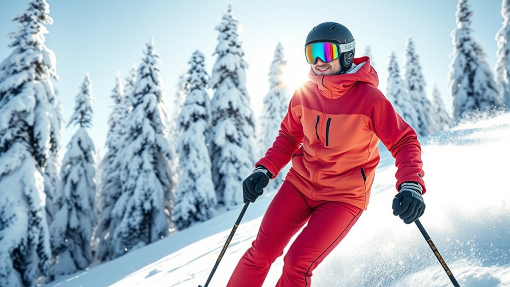 I find that thermal underwear should fit snugly but not too tight, allowing for full mobility and layering without restricting movement. A close fit traps heat effectively while still feeling comfortable. I look for materials that stretch, like merino wool or synthetic blends, to make certain I stay warm and dry. If it’s too loose, warmth escapes; if it’s too tight, it’s uncomfortable. Finding that perfect fit makes all the difference on the slopes.